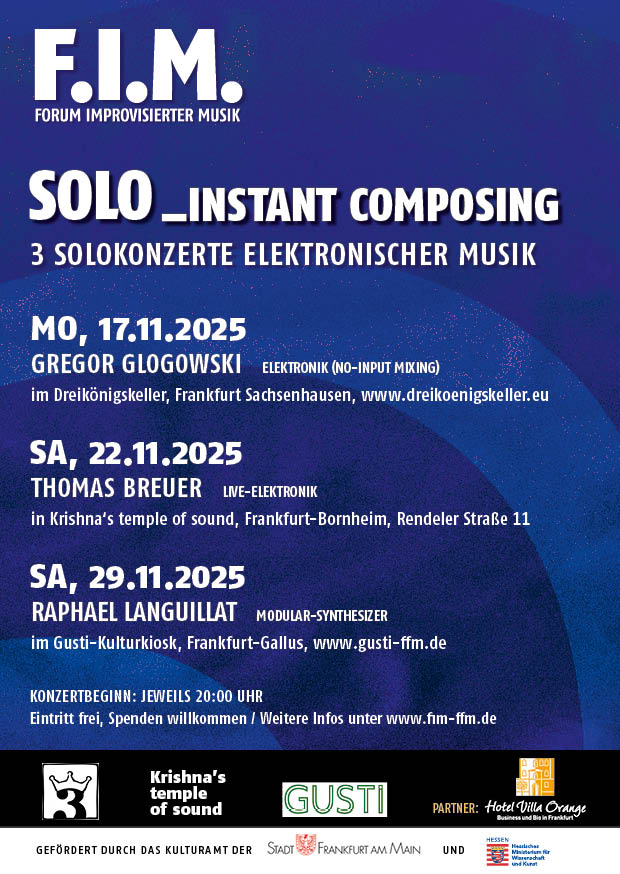 Halym Aabo-Kim, Nana Pi Aabo-Kim, Jonathan Aardestrup, Christine Abdelnour, Julia Alsdorf (Tanz) Bülent Ates, Christoph Aupperle, Thomas Bachmann, Nik Bärtsch, Savas Bayrak, Lucía María Rubio Belda (Tanz), Isabelle Bodenseh, Michael Bossong, Paul Cannon, Nico Chientaroli, Tony Clark, Max Clouth, Elisabeth Coudoux, Marcel Daemgen, Marlies Debacker, Matthias TC Debus, Bob Degen, Christopher Dell, Erwin Ditzner, Maria Dybbroe, Mia Dyberg, Nigel Edwards, Izabella Effenberg, Peter Feil(†), Jörg Fischer, Fred Frith, Fe Fritschi, Valentin Garvie, Bernhard Gehrke, Martin Götte, Igor Grabez, Sebastian Gramss, Frank Gratkowski, Devin Gray, Gerhard Gschlößl, Daniel Guggenheim, Fred Guntermann, Fabian Habicht, Katharina Hamp, Peter Hanson, Alfred 23 Harth, Ruben Hausmann, Shay Hazan, Nicola Hein, Frederich Helbing, Christopher Herrmann, Matthias Hoch, Matt Hollenberg, Oscar Jan Hoogland, Carl Ludwig Hübsch, Lutz Jahnke, Jazzmadass, Salim Javaid, Jo Jena, Wilbert de Joode, Willi Kappich, Aki Kitajima, Naoko Kikuchi, Henri Klein (Tanz), Peter Klohmann, Stefan Kohmann, Athina Kontou, Liz Kosack, Burkard Kunkel, Kathrin Lambert, Christof Lauer, Sonia Lautenbacher (Tanz), Lömsch Lehmann, Martin Lejeune, Gunnar Lettow, Christian Lillinger, Abril Lukac (Tanz), Andrea Maria Maeder (Tanz), Rudi Mahall, Dominik Mahnig, Dirk Marwedel, Felix Mayer, Annick Moerman, Michael Moore, Oliver Potratz, Puschan Mousavi Malvani, Frederik Maul, Heiner Metzger, Nikolai Muck, Matthias Muche, Sana Nagano, Ali Neander, Andreas Neubauer, Mani Neumeier, Etienne Nillesen, Uwe Oberg, Richard Oberscheven (Tanz), Eric Plandé, Maria Portugal, Christian Ramond, Emma Rasmussen (Tanz), Ada Rave, Ulrich Raupach, Wolfgang Reimers, Vitold Rek, Michael Riessler, Bertram Ritter, Jan Roder, Guilherme Rodrigues, Isabel Rößler, Chris Rücker, Eric Ruffing, Olaf Rupp, Páula Sánchez, Georgia Sassone (Tanz) Silvia Sauer, Heinz Sauer, Felicitas Schauer, Uli Schiffelholz, Wolfgang Schliemann, Sue Schlotte, Martin „Schmiddi“ Schmidt, Daniel Schmitz, Britta Schönbrunn (Tanz), Matthias Schubert, John Schröder, Ulrike Schwarz, Aleksandra M. Ścibor Infinity (Tanz), Khadim Seck, Danny Sher, Angelika Sheridan, Emilie Škrijelj, Dennis Sekretarev, Aleksandar Skoric, Jasper Stadhouders, Sebastian Sternal, Mieko Suzuki, Peter Stock, Tassos Tataroglu, Ziv Taubenfeld, Christof Thewes, Hasan O Tuna, Jan-Filip Tupa, Birgit Ulher, Harvey Valdes; Matthias Vogt, Luise Volkmann, Marta Warelis, Rainer Weber, Ingo Weiß, Uschi Wentzell, Bastian Weinig, Jürgen Werner, Jonas Westergaard, Katharina Wiedenhofer (Tanz), Philipp Wildenhues, Georg Wolf, Jürgen Wuchner(†), Eva Zöllner, Kathrin Zurborg